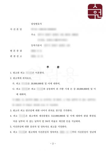 의뢰인이 미성년 자녀를 부양해야 하는 점 등을 주장하여 의뢰인의 기여도가 상당하다는 점을 작성한 준비 서면을 제출하였습니다.