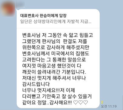 이에 의뢰인께서는 법무법인 승원 변호사 및 송무팀에 감사의 인사를 전해주셨습니다.