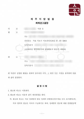법무법인 승원은 의뢰인과 남편이 합의한 내용을 담은 화해권고결정 요청서를 법원에 제출하여 해당 내용대로 이혼은 확정되었고,