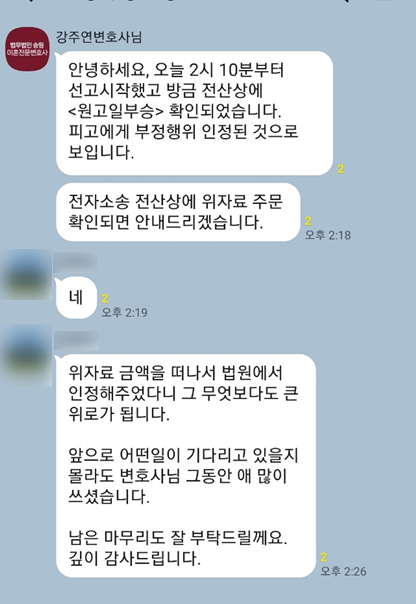 부정행위가 인정되지 않을 것을 걱정한 의뢰인이 빠르게 안심할 수 있도록, 전자소송 시스템을 통하여 판결 내용을 신속히 확인하여 공유해드렸고, 의뢰인은 상간녀의 부정행위가 인정된 데에 크게 만족하셨습니다.